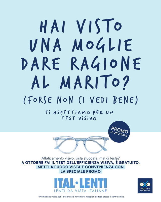 Dal 1 ottobre al giorno 8 novembre 2025, acquistando una coppia di lenti progressive Ital Lenti (modelli Premium Armonie, Premium o Sky) con trattamento antiriflesso Iron, puoi riceverne un secondo paio gratis, per te o per un familiare.